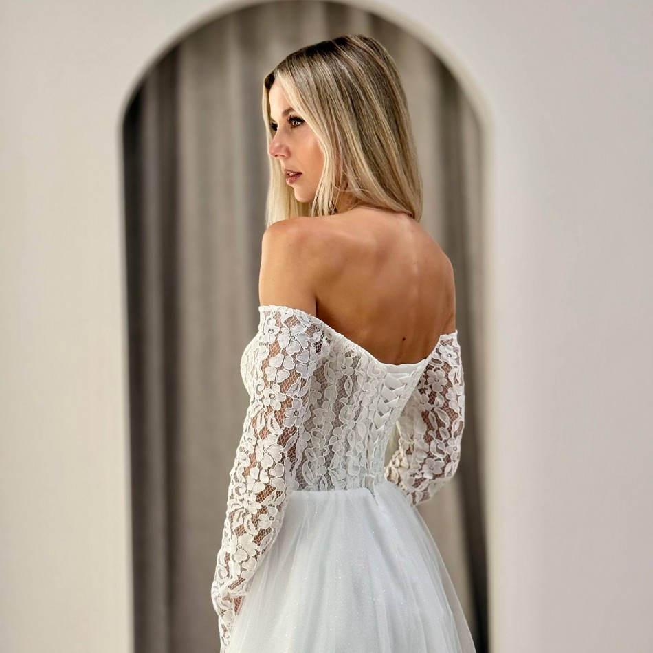Свадебное Платье "Памира" с ажурным корсетом , выполнено из кордового кружева, что придает образу элегантность и утонченность ! Юбка с микроблеском из еврофатина, премиального качества!