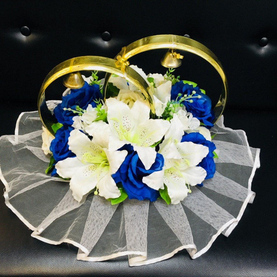Цветочная композиция на крышу машины. Синие розы и белые лилии.