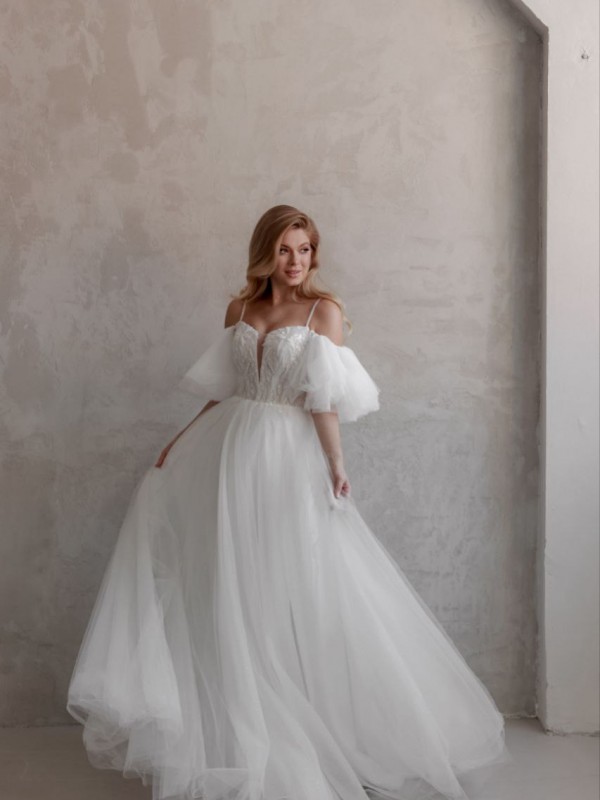 Свадебное платье "Арабика" не оставит ни одну невесту без восторга! Лиф выполнен ручной вышивкой / Юбка из еврофатина высшей категории / Воздушные воланы, по рукам придают силуэту нежный, легкий образ ( воланы съемные)