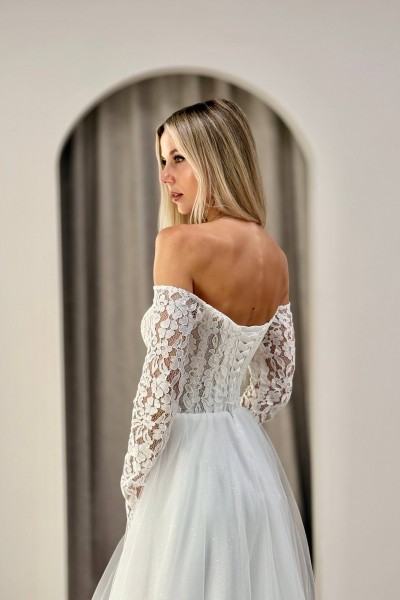 Свадебное Платье "Памира" с ажурным корсетом , выполнено из кордового кружева, что придает образу элегантность и утонченность ! Юбка с микроблеском из еврофатина, премиального качества!