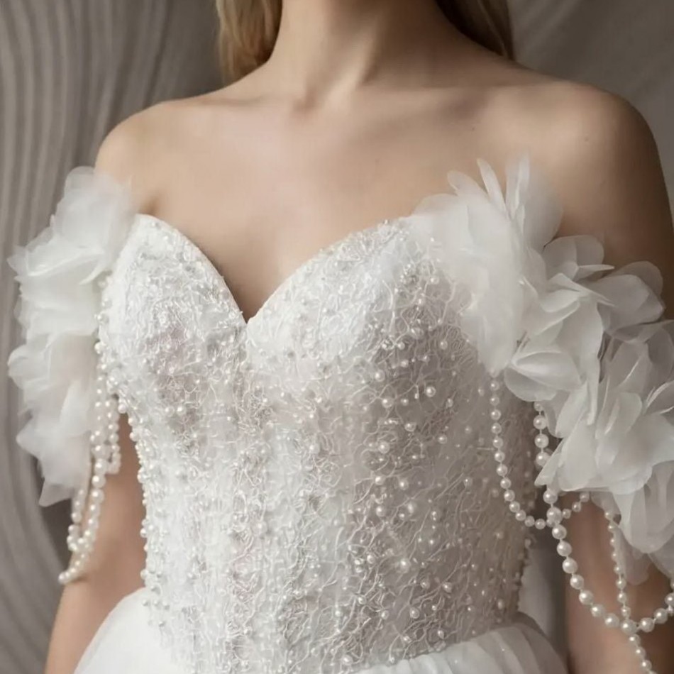 • Изумительное свадебное платье,лиф расшит кружевом из пайеток,бисера и блесток,что создает сияющий образ)