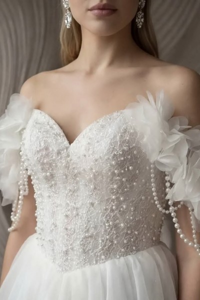 • Свадебное Платье "Памира" с ажурным корсетом , выполнено из кордового кружева, что придает образу элегантность и утонченность ! Юбка с микроблеском из еврофатина, премиального качества!